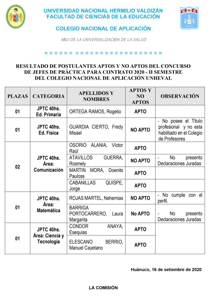 RESULTADO DE POSTULANTES APTOS Y NO APTOS DEL CONCURSO DE JEFES DE PRÁCTICA PARA CONTRATO 2020 – II SEMESTRE DEL COLEGIO NACIONAL DE APLICACIÓN UNHEVAL